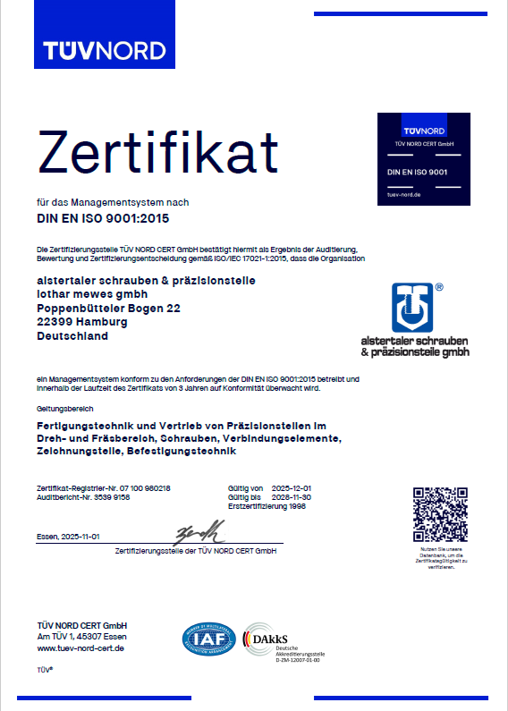 Mit der Einführung unseres Qualitätsmanagementsystems – bereits im Jahre 1998 – wurde die Qualität unserer Sonderschrauben und Präzisionsteile sowie unserer gesamten Arbeitsprozesse stetig verbessert und für unsere Kunden transparent dokumentiert.